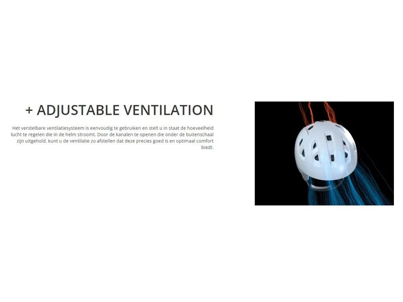 Ons instelbare ventilatiesysteem is gemakkelijk te gebruiken en stelt u in staat om de hoeveelheid lucht die in uw helm komt te regelen. Openingskanalen onder de schaal kunnen worden afgesteld om u de exacte hoeveelheid ventilatie te geven die u nodig heeft voor maximaal comfort.